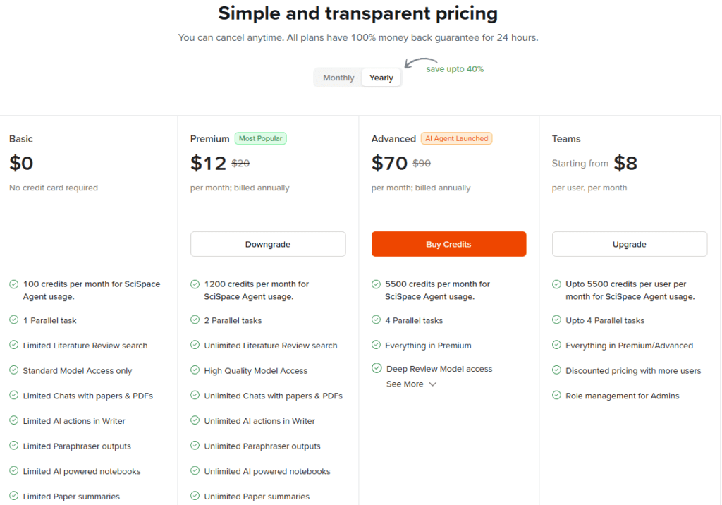 鉴于 SciSpace 在研究支持方面的功能完整性与稳定性,本文更建议优先考虑付费计划(高级计划起价为 7.2 美元/月)。